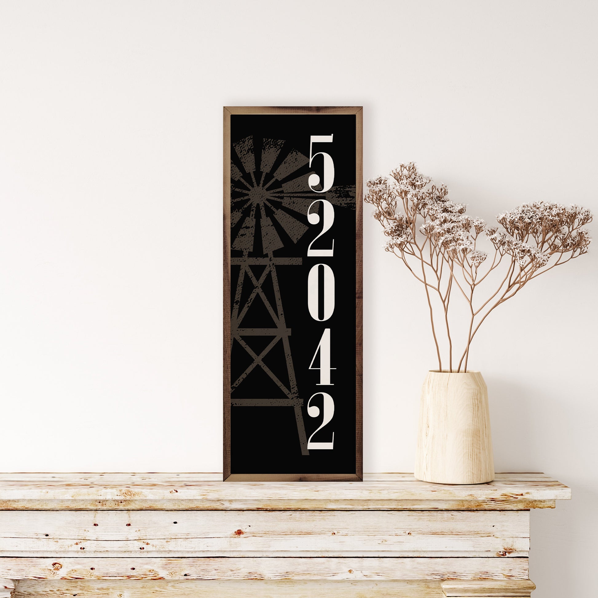 Bring a touch of rustic charm to your home with our Rustic Windmill & Vertical Zip Code Sign. This unique design combines the timeless beauty of a rustic windmill with the personal touch of your own zip code displayed vertically. Whether you're celebrating your hometown or simply love the country-inspired aesthetic, this sign adds warmth and character to any room in your home.